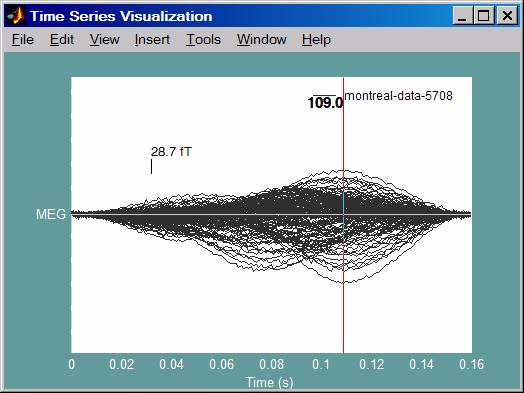 The red cursor line will initially be found at the far left side, left click and drag it to the desired point in the data overlay, as above, to see the different spatial patterns on the min norm cortex in the other window.